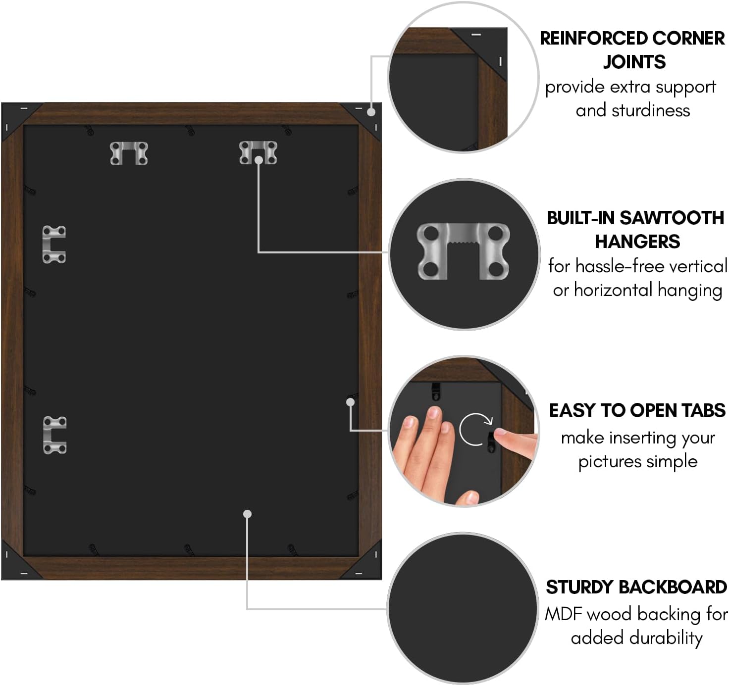 Built from durable engineered wood, the frame is topped with polished plexiglass that protects your content from dust and scratches while ensuring a crystal-clear display. The rear utility frame includes easy-to-open turning tabs and hanging hardware pre-installed for both vertical and horizontal display—making swapping pictures and placement simple and seamless.